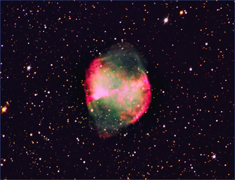 The Dumbbell Nebula is one of the brightest and best known examples of planetary nebulae in the sky. This type of nebula is a star in the process of dying, but instead of collapsing on itself and exploding as a supernova, its mass and its evolution dictates that it "break apart" more gently and slowly eject it's material in to space.