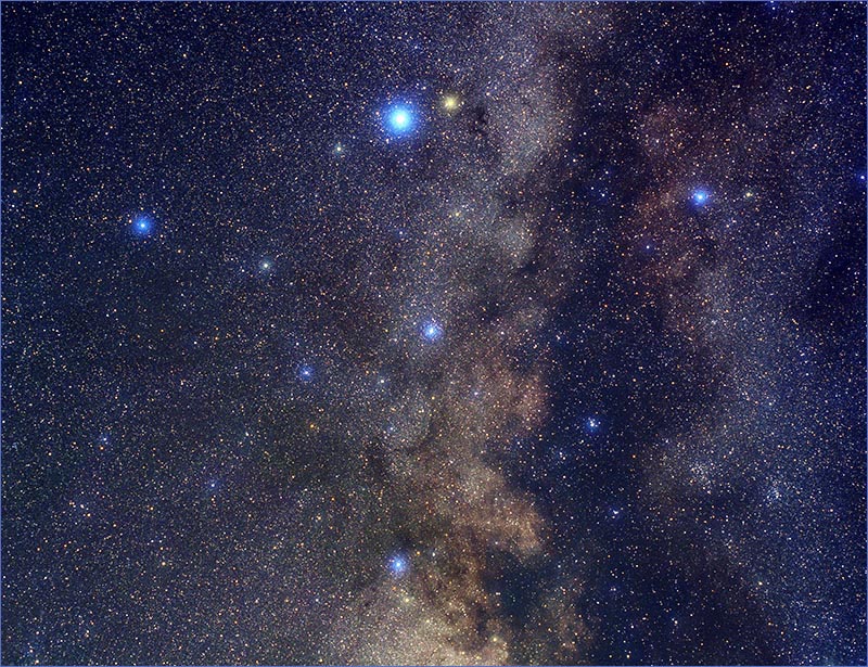 It also reveals deep detail in this region of the sky including many star clusters. The cloud-like structure divided by numerous dark patches is the Milky Way seen in deep photographic exposure. The Milky Way is the glow of accumulated starlight from the billions of distant stars that make up the disk of our galaxy.