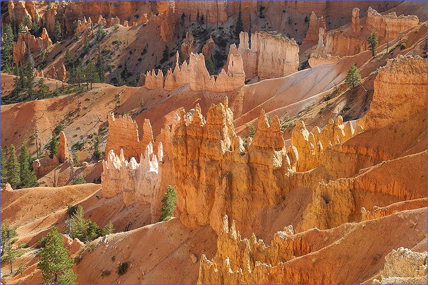 Bryce Canyon National Park is a collection of giant natural amphitheaters along the eastern side of the Paunsaugunt Plateau. These "amphitheaters" are filled with geological structures called hoodoos, formed by frost weathering and stream erosion of the river and lake bed sedimentary rock.