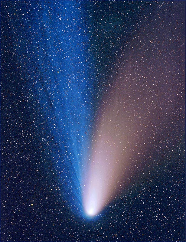 This color photo reveals both the reddish-cream color dust tail, and the many long blue streamers of the ion tail.