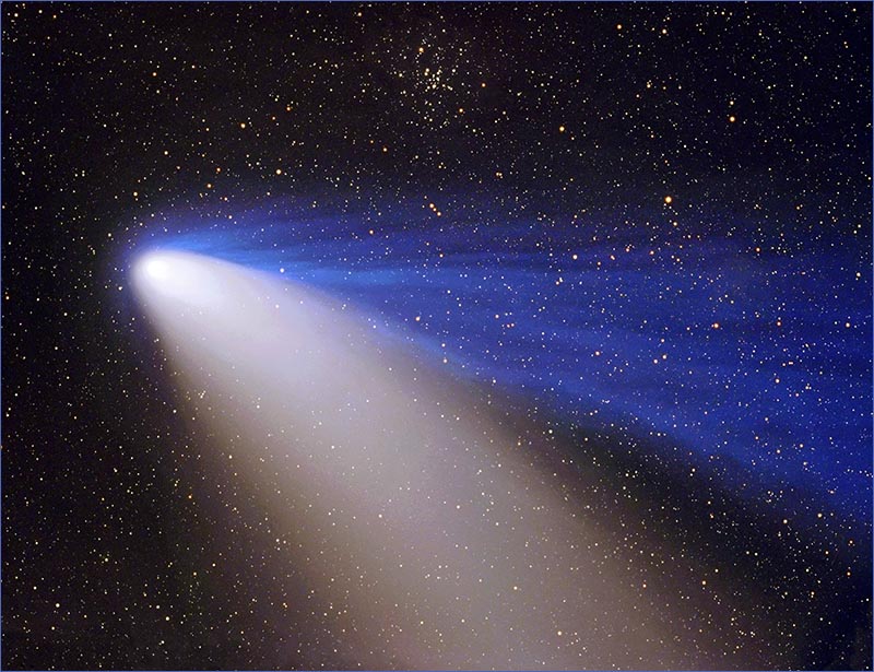 This color photo reveals both the reddish-cream color dust tail, and the many long blue streamers of the ion tail. The photo was taken on the night that Comet Hale-Bopp passed by the open star cluster M34 in the constellation Perseus.