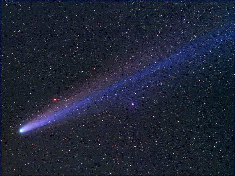 This color photo reveals the blue-green glow around the coma, the yellow-red shroud of a dust tail, and the many long blue streamers of the ion tail.