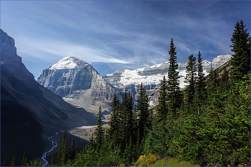 Hiking the trail from Lake Louise to the Lake Agnes Tea House you come upon many glorious views of other mountains and glaciers in area. This photo, taken in the Fall is of Mount Lefroy (left - 11,200 ft.), Mount Victoria (to the right - 11,365 ft.), and the Mount Victoria Hanging Glacier.