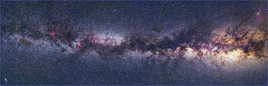 This panorama of the Milky Way (our galaxy) was assembled from 5 individual photographs. It shows what 1/2 of our galaxy looks like as seen from the central core to one outer edge. This photo was taken from the Northern Hemisphere, so the view is from the constellation Scorpius on the right side, to Cassiopeia at the left. To see a larger image - Click Here
