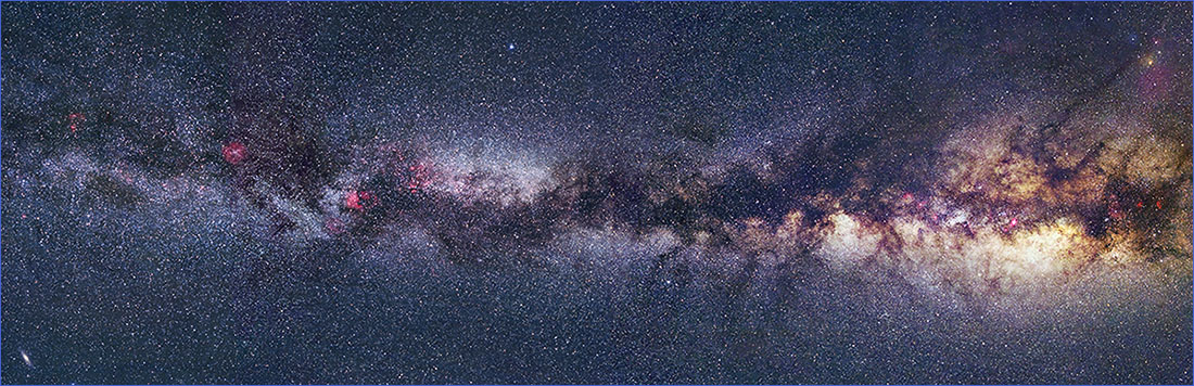 This panorama of the Milky Way (our galaxy) was assembled from 5 individual photographs. It shows what 1/2 of our galaxy looks like as seen from the central core to one outer edge. This photo was taken from the Northern Hemisphere, so the view is from the constellation Scorpius on the right side, to Cassiopeia at the left.
