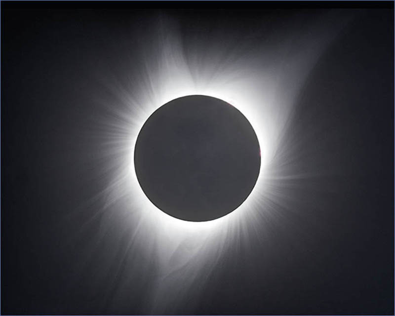 Great detail including arching steamers at the sun's North and South poles are captured in this photo along with a faint view of "earthshine" on the obscuring moon's surface.