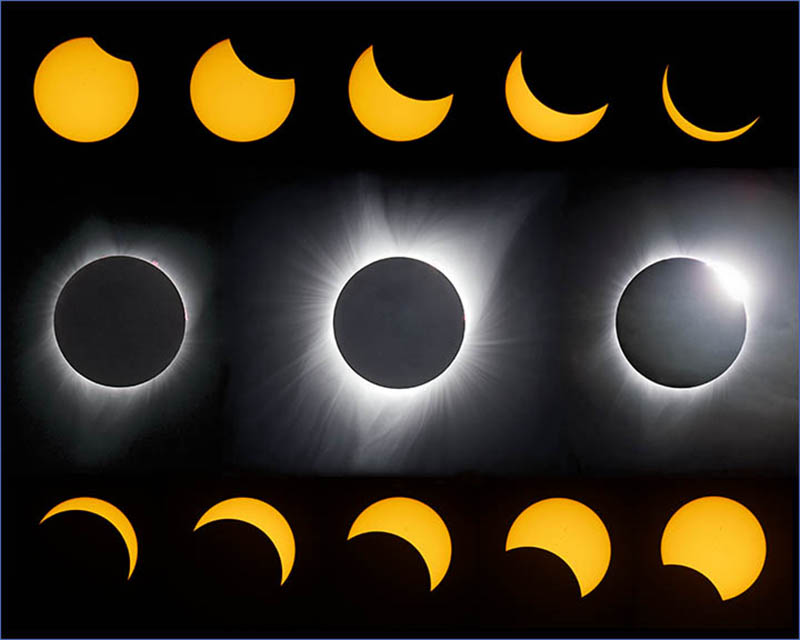 This collage includes images from the entire progression of the eclipse. The progression started with the partial eclipsing as the moon began to cover the sun. Just before the moon had completely covered the sun, the "Diamond Ring" effect occured. Moments after, the full glory of the corona burst into view and even prominences (red filaments) could be seen.