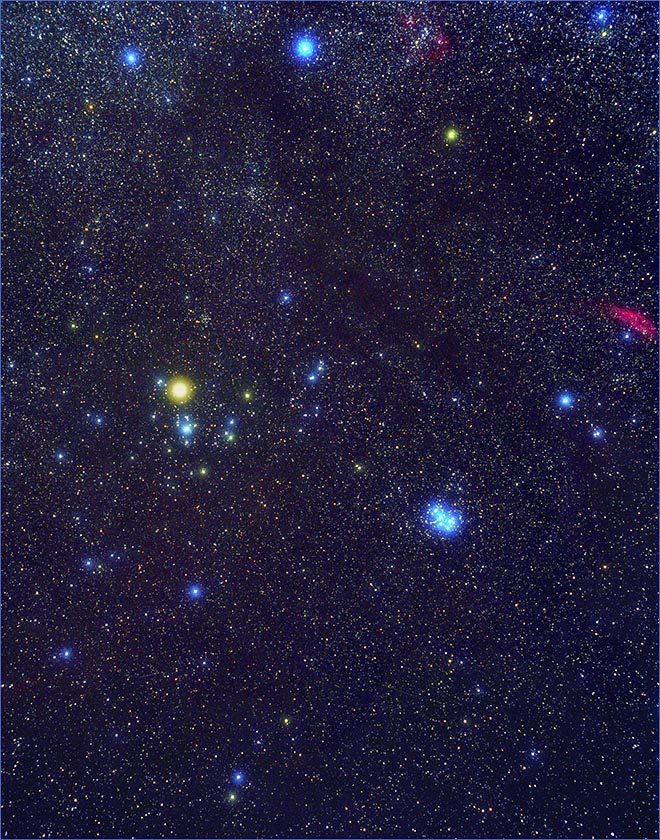 This photo of Taurus shows, enlarged in their true color, the main "naked eye" stars that make up the shape of the constellation. This is a natural photographic technique with the effect created during a single exposure of the film.
