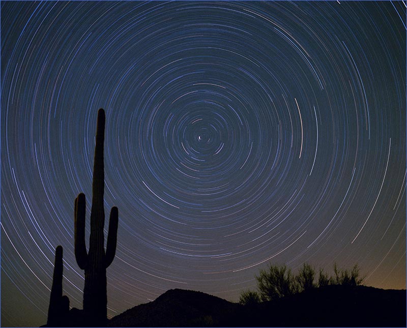 The setting for this star trails photo is the pristine desert landscape of the Organ Pipe National Monument in Southern Arizona. The Seguaro cactus in the foreground is at least 25 feet tall.