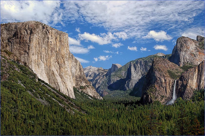 This photo was taken in late fall in Yosemite Valley after a good rain with snow in the higher elevations so the waterfalls were running well. This vantage point of Yosemite Valley shows El Capitan on the left, Half Dome center (far), and Bridalveil Fall on the right.